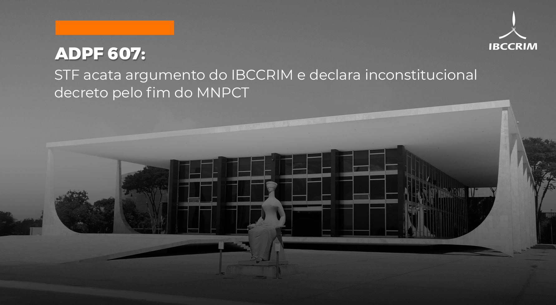 ADPF 607: STF acata argumento do IBCCRIM e declara inconstitucional decreto pelo fim do MNPCT O IBCCRIM celebra a decisão do Plenário do Supremo Tribunal Federal (STF) que, por unanimidade, declarou inconstitucional o Decreto 9.831/2019. Leia mais » março 2022