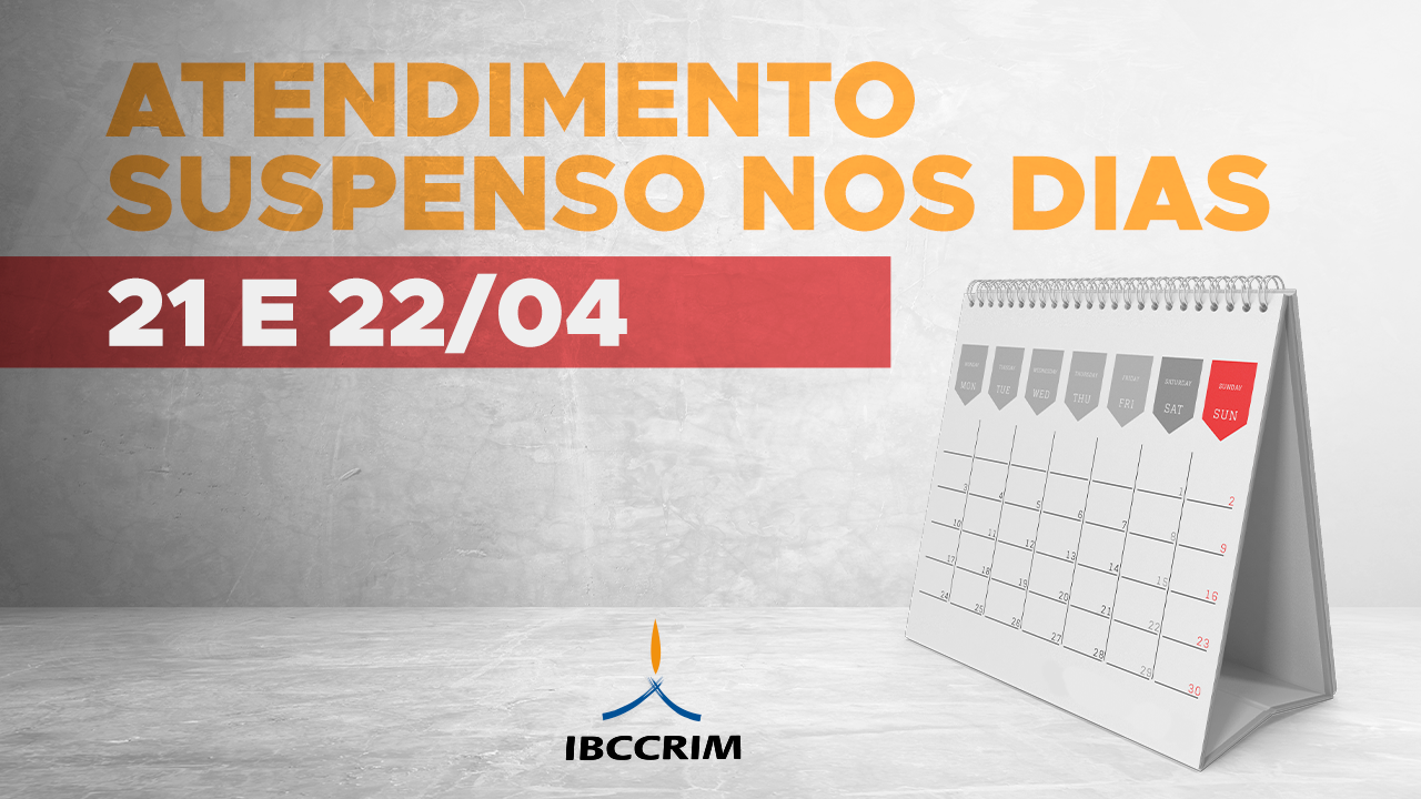 Atendimento suspenso no feriado de Tiradentes O IBCCRIM não funcionará nos dias 21 e 22/4 devido ao feriado de Tiradentes. Bom feriado a todos e todas! Leia mais » abril 2022