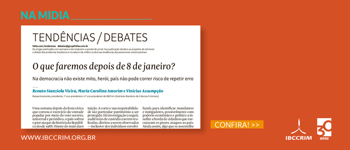 O que faremos depois de 8 de janeiro? Foi publicado hoje (16) artigo de autoria do presidente do IBCCRIM, Renato Stanziola Vieira, e dos vice-presidentes, Maria Carolina Amorim Leia mais » janeiro 2023