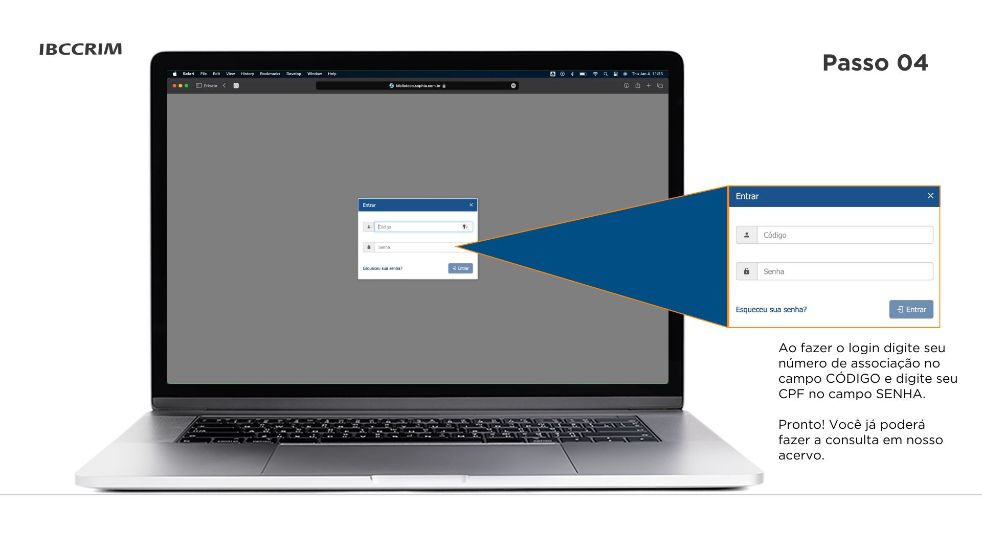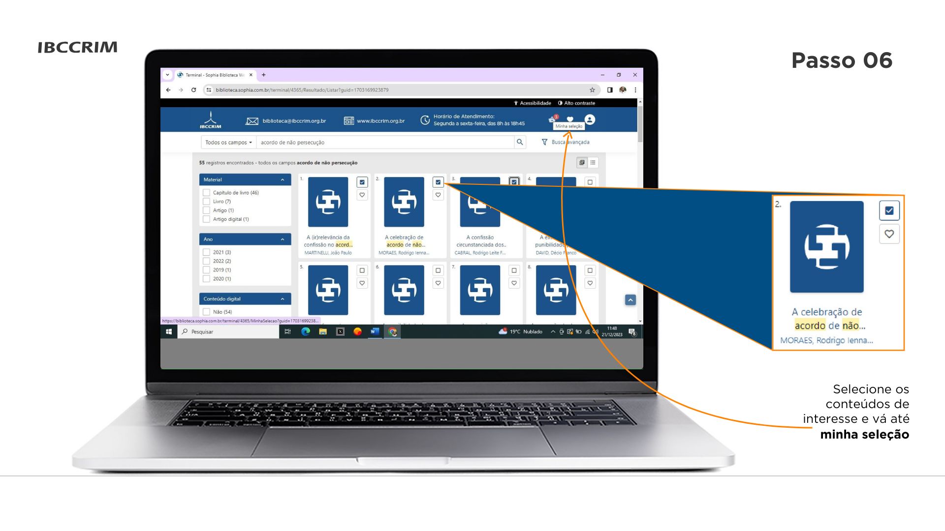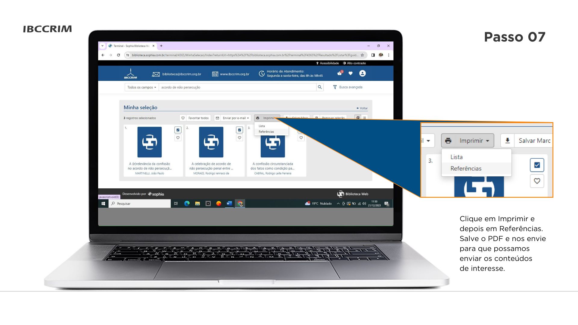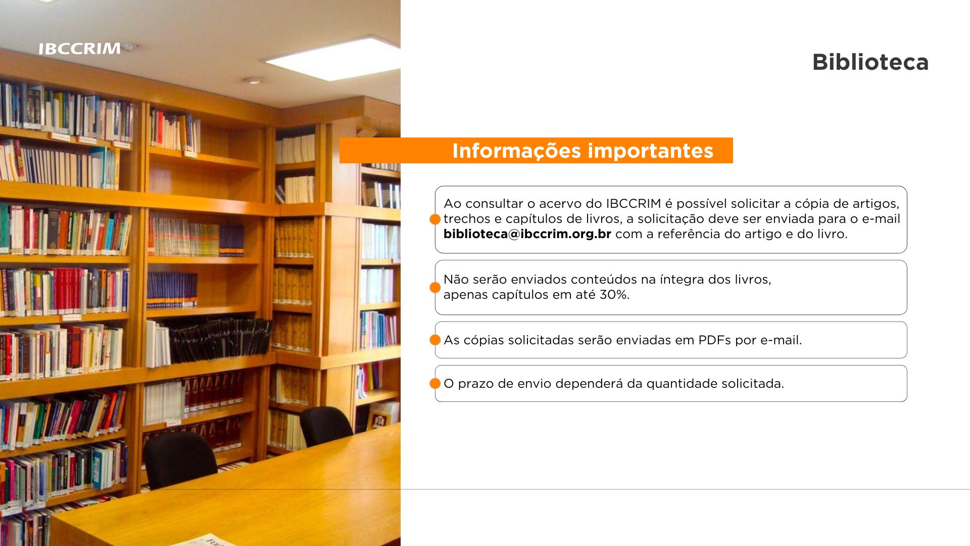 Para requisitar materiais à biblioteca, o associado poderá copiar o URL com apenas um clique e enviar a solicitação para o e-mail biblioteca@ibccrim.org.br.