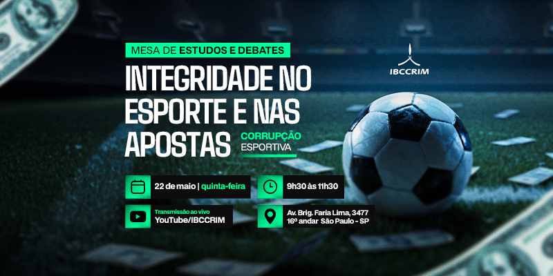 No dia 22 de maio, das 9h às 11h, o IBCCRIM promove a Mesa de Estudos e Debates “Integridade no esporte e nas apostas – corrupção esportiva”. O encontro será